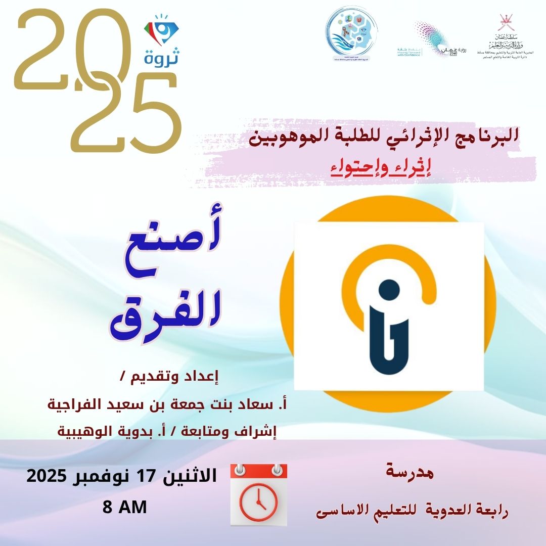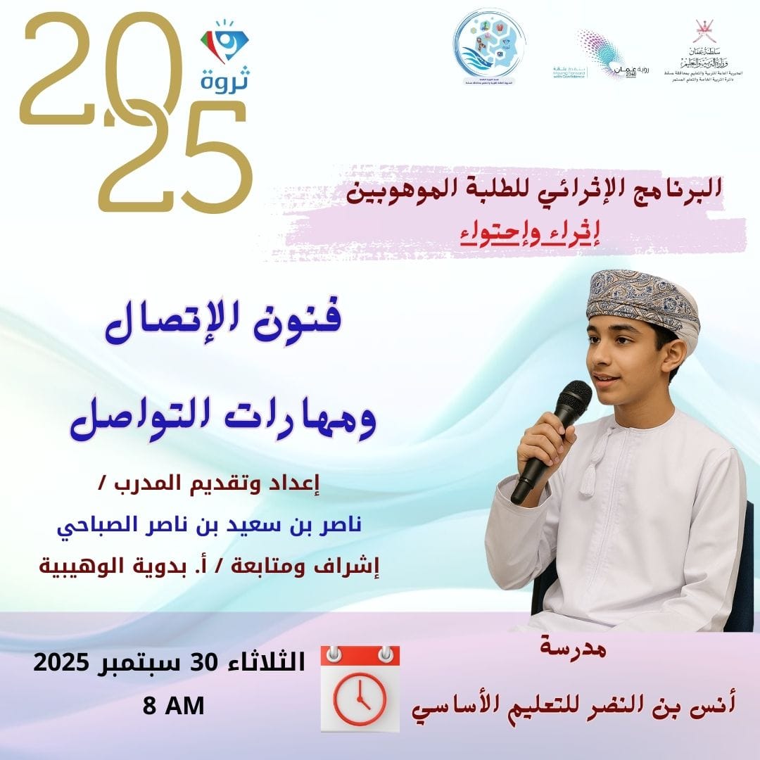 برنامج تدريبي حضوري مباشر للطلبة الموهوبين يشتمل على العديد من الورش التدريبية برفقة نخبة من الاساتذه والمدربين يتم تقديمها في مدارس الطلبة الموهوبين بالمحافظة بهدف صقل مهارات الطالب الموهوب الإدارية والقيادية ليصبح قائد ومؤثر الغد..