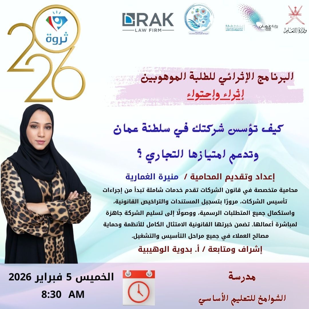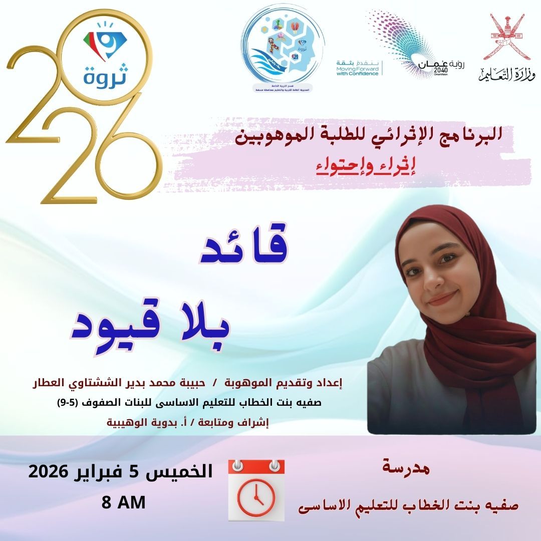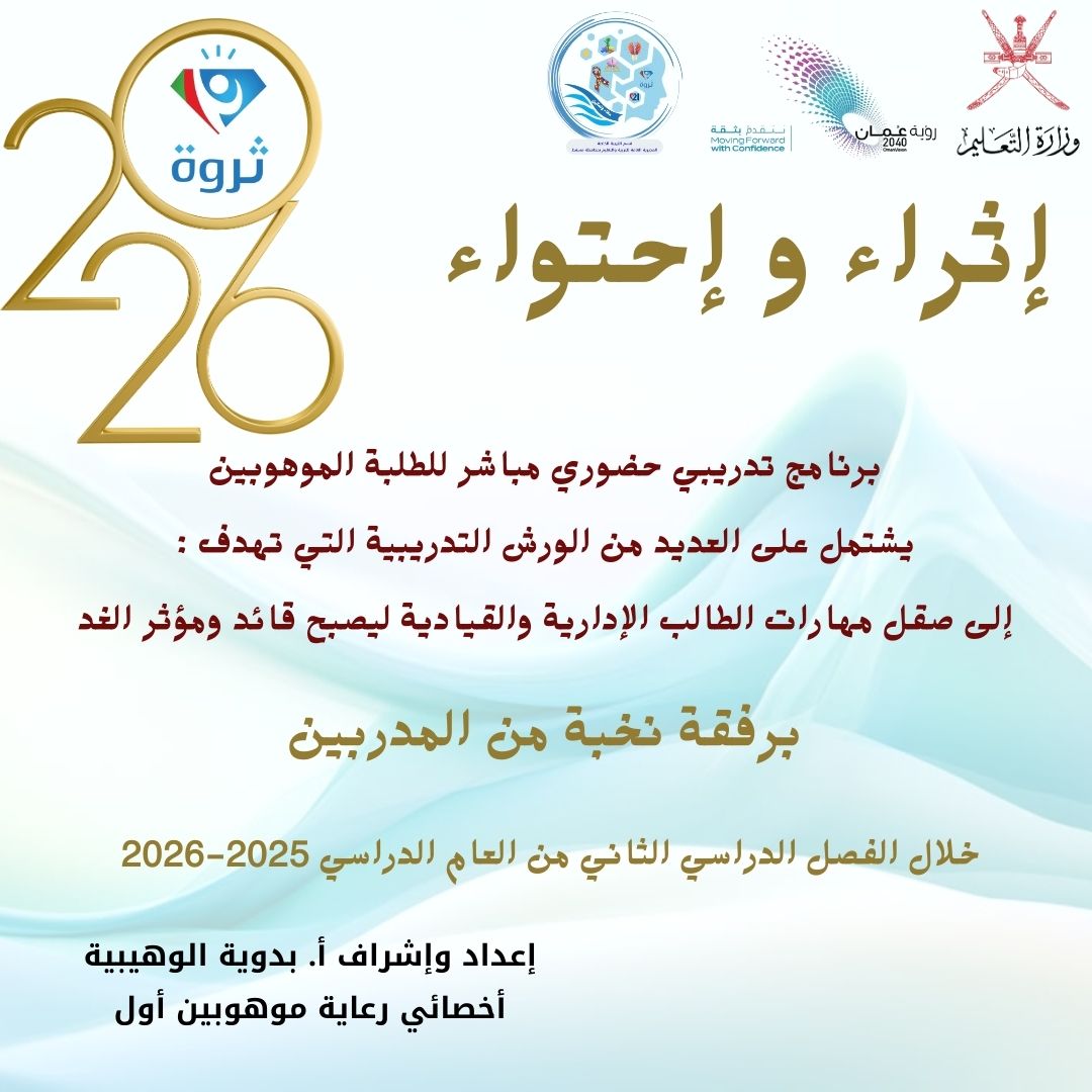 برنامج تدريبي حضوري مباشر مدمج للطلبة الموهوبين والطلبة المجيدين في الانشطة المدرسية والابتكار العلمي يشتمل على العديد من الورش التدريبية برفقة نخبة من الاساتذه والمدربين يتم تقديمها في مدارس الطلبة الموهوبين بالمحافظة بهدف صقل مهارات الطالب الموهوب الإدارية والقيادية ليصبح قائد ومؤثر الغد..